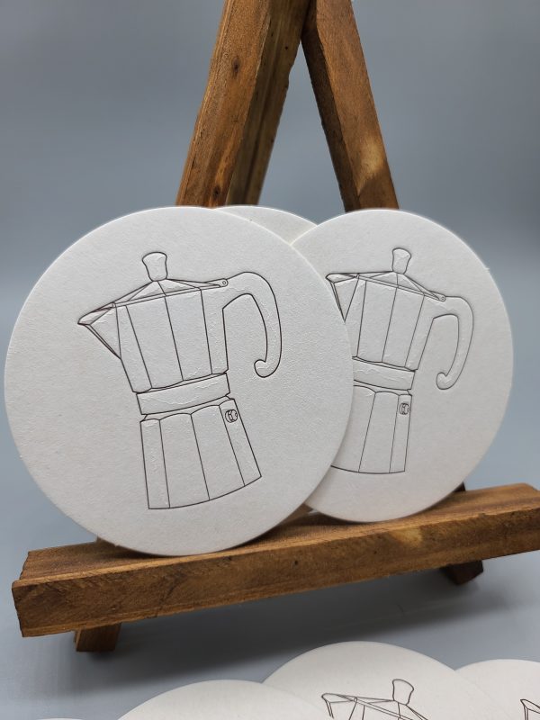 A set of 10 letterpress printed coasters. Featuring a custom drawn stovetop espresso maker as a part of my Coffee Series letterpress designs.