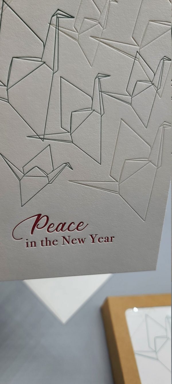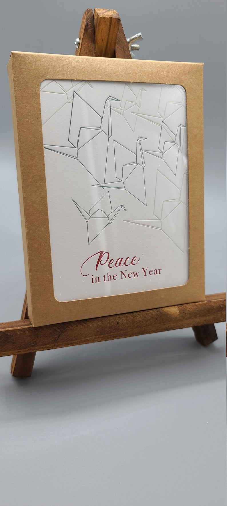 Three-color letterpress printed Folding cards featuring the symbol of peace, the origami crane. These come in a set of 6 with matching cotton envelopes.